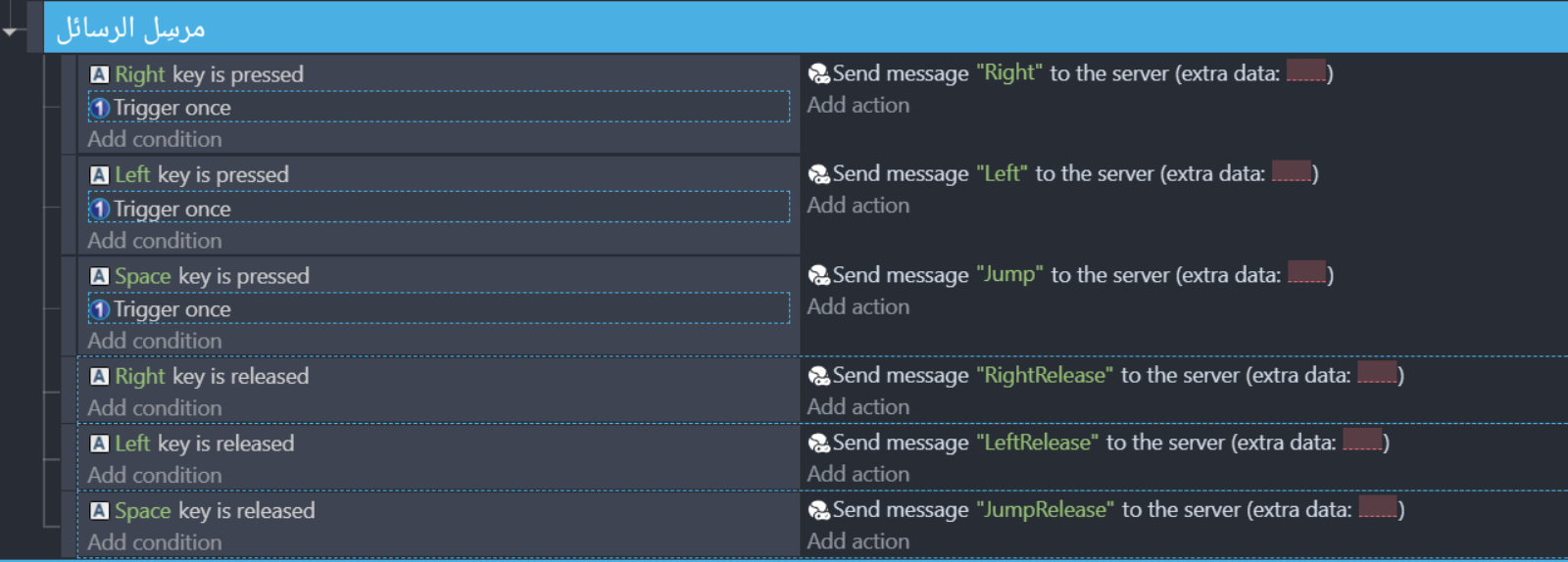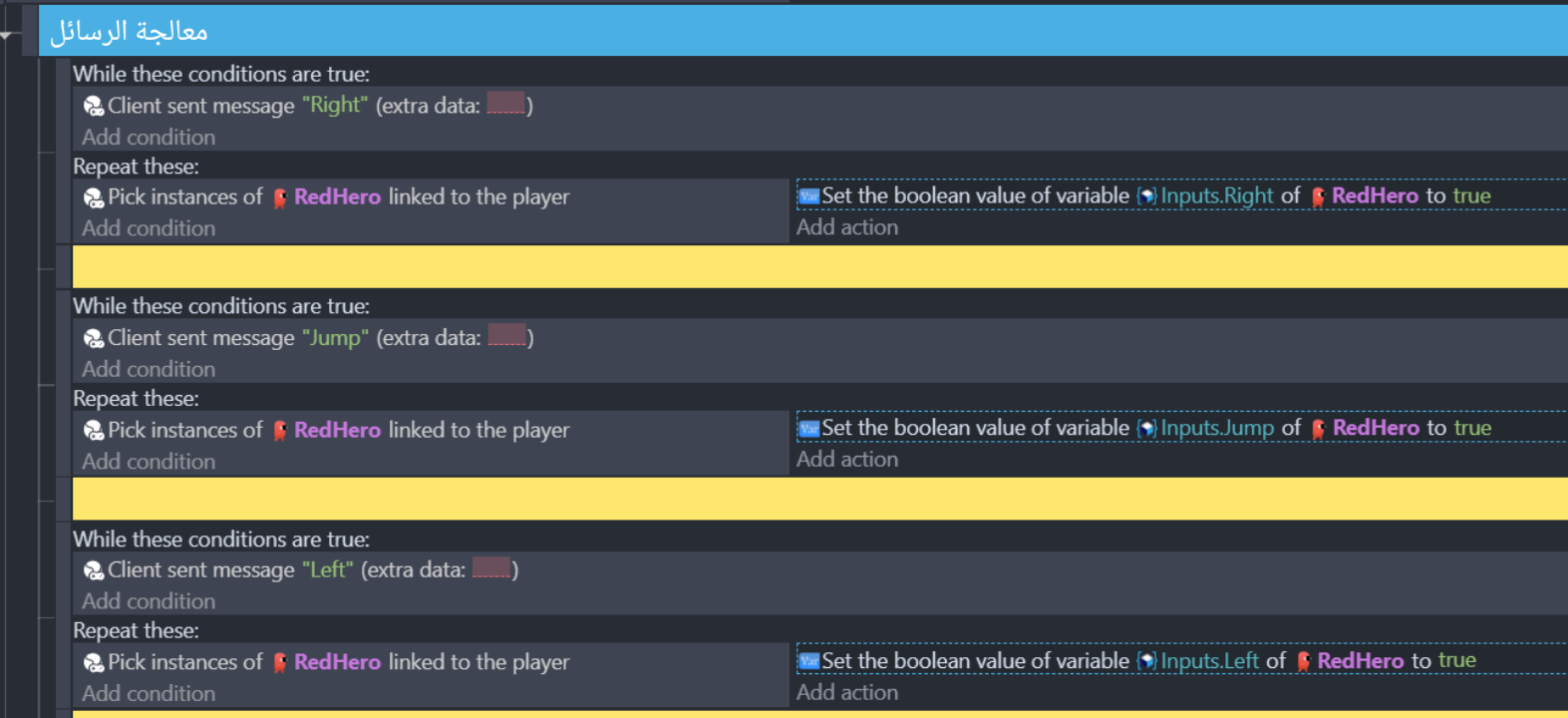 Receiving events in a normal event is more readable, but it only allows to process one message per server tick, as the condition is only called once. ترك الرسائل تنطلق دون معالجة ويتم التعامل معها على الدقة التالية من المحتمل أن يسبب مشكلة إذا أرسل العديد من اللاعبين هذه الرسائل كثيرًا. للتعامل مع جميع الرسائل المستلمة في دقة خادم واحدة، استخدم حدث المدة الزمنية للتعامل مع الأحداث بينما بعضها متاح للمعالجة: