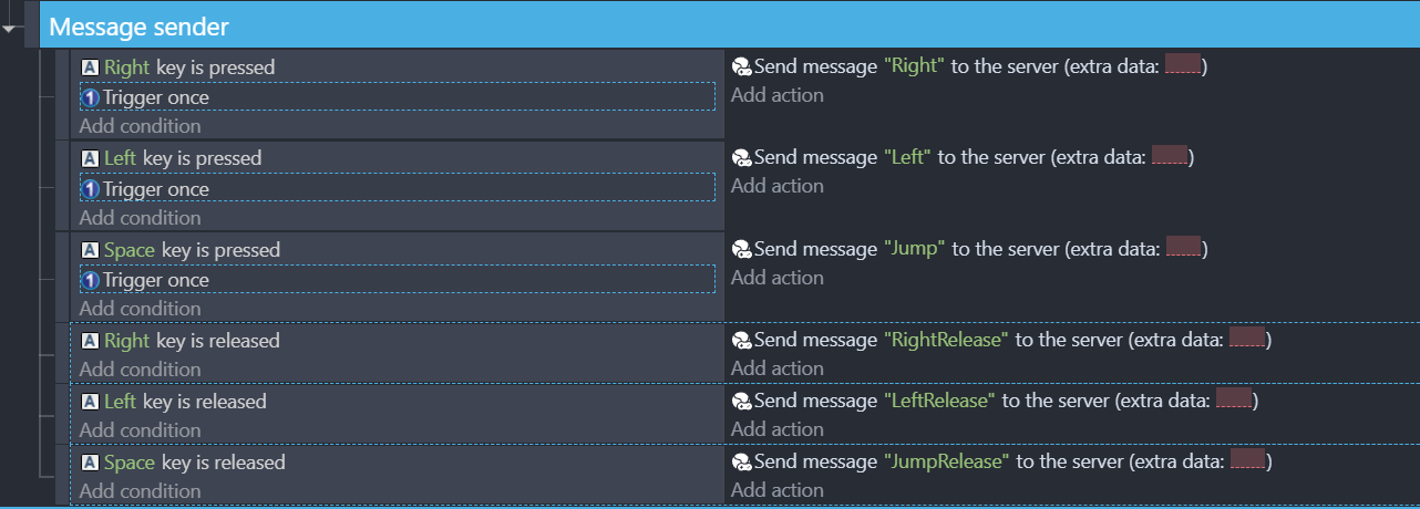In this case, all we need to do is send the inputs from the clients and feed them to the platformer behavior. The platformer behavior will process the way the object should move and update the position automatically, taking care of the "validation and updating game state" part of message handling.